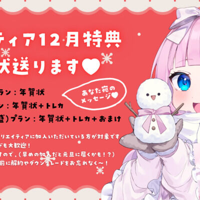 はろんな~!(🍓ơωơ。)🔎 音沙汰あんなですっ✨ 今回プレゼント企画やっちゃいます!!! クリエイティアに加入いただいている方皆様に 「あなた宛の年賀状」をプレゼントします🎉 いちごソーダプランの方には「年賀状」! カツカレープランの方にはプラス「あんなトレカ」付き! カツカレープラン(大...